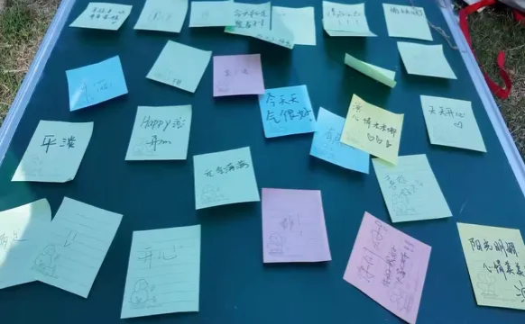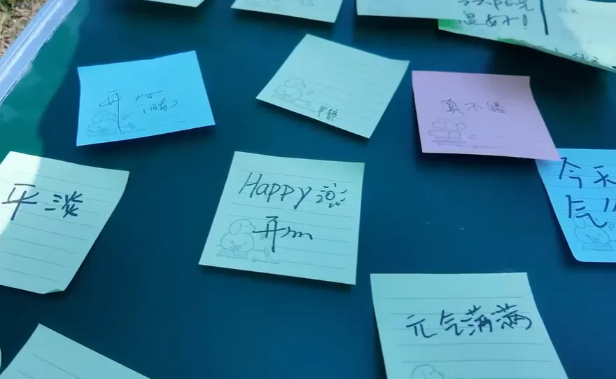 活动伊始,每位同学根据“情绪色彩心理板”领取不同颜色的便签,写下近期的感受并粘贴至共享黑板。蓝、黄、粉等色彩交织,直观展现了班级成员的心理状态。通过匿名分享,同学们在共鸣中拉近了彼此的距离。